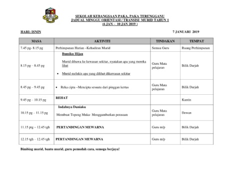 JADUAL MINGGU ORIENTASI / TRANSISI MURID TAHUN 1