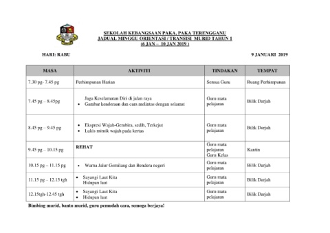 JADUAL MINGGU ORIENTASI / TRANSISI MURID TAHUN 1