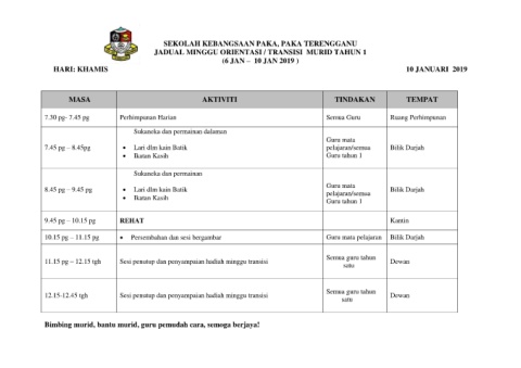 JADUAL MINGGU ORIENTASI / TRANSISI MURID TAHUN 1