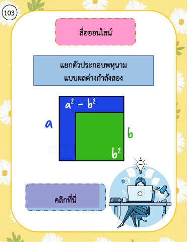 103 สื่อออนไลน์ แยกตัวประกอบพหุนาม แบบผลต่างก าลังสอง คลิกที่นี่