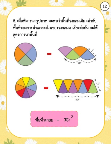 12 8. เมื่อพิจารณารูปภาพ จะพบว่าพื้นที่วงกลมเดิม เท่ากับ พื้นที่ของการน าแต่ละส่วนของวงกลมมาเรียงต่อกัน จะได้ สูตรการหาพื้นที่ ของวงกลม = = พื้นที่วงกลม = πr 2