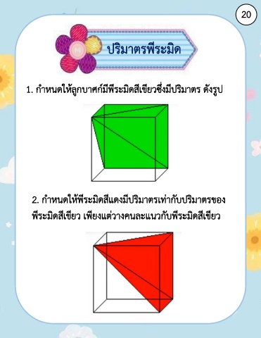 20 ปริมาตรพีระมิด 1. ก าหนดให้ลูกบาศก์มีพีระมิดสีเขียวซึ่งมีปริมาตร ดังรูป 2. ก าหนดให้พีระมิดสีแดงมีปริมาตรเท่ากับปริมาตรของ พีระมิดสีเขียว เพียงแต่วางคนละแนวกับพีระมิดสีเขียว