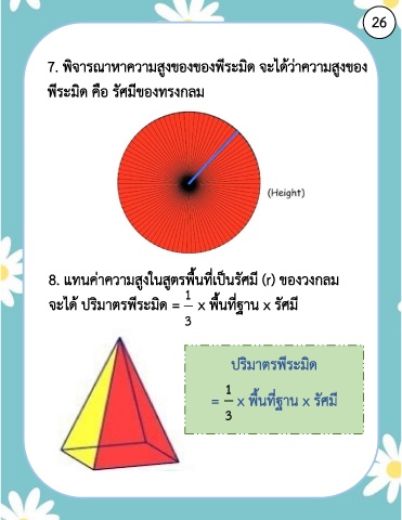 26 7. พิจารณาหาความสูงของของพีระมิด จะได้ว่าความสูงของ พีระมิด คือ รัศมีของทรงกลม 8. แทนค่าความสูงในสูตรพื้นที่เป็นรัศมี (r) ของวงกลม 1 จะได้ ปริมาตรพีระมิด = x พื้นที่ฐาน x รัศมี 3 ปริมาตรพีระมิด 1 = x พื้นที่ฐาน x รัศมี 3