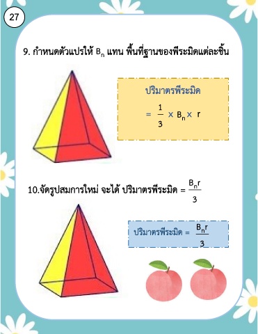 27 9. ก าหนดตัวแปรให้ แทน พื้นที่ฐานของพีระมิดแต่ละชิ้น B n ปริมาตรพีระมิด 1 = x x r B n 3 B r 10.จัดรูปสมการใหม่ จะได้ ปริมาตรพีระมิด = n 3 B r ปริมาตรพีระมิด = n 3