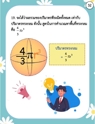32 19. จะได้ว่าผลรวมของปริมาตรพีระมิดทั้งหมด เท่ากับ ปริมาตรทรงกลม ดังนั้น สูตรในการค านวณหาพื้นที่ทรงกลม คือ 4 r 3 3 ปริมาตรทรงกลม 4 3 = r 3
