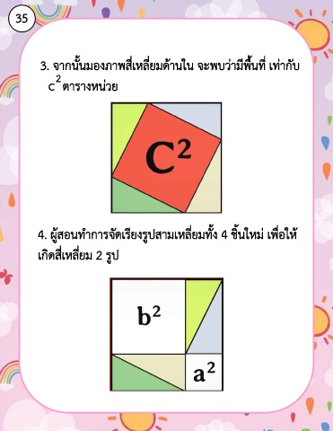 35 3. จากนั้นมองภาพสี่เหลี่ยมด้านใน จะพบว่ามีพื้นที่ เท่ากับ c 2 ตารางหน่วย 4. ผู้สอนท าการจัดเรียงรูปสามเหลี่ยมทั้ง 4 ชิ้นใหม่ เพื่อให้ เกิดสี่เหลี่ยม 2 รูป