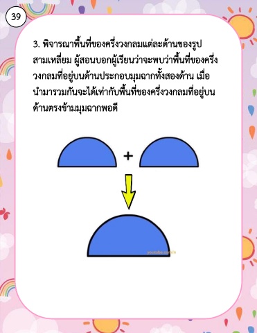 39 3. พิจารณาพื้นที่ของครึ่งวงกลมแต่ละด้านของรูป สามเหลี่ยม ผู้สอนบอกผู้เรียนว่าจะพบว่าพื้นที่ของครึ่ง วงกลมที่อยู่บนด้านประกอบมุมฉากทั้งสองด้าน เมื่อ น ามารวมกันจะได้เท่ากับพื้นที่ของครึ่งวงกลมที่อยู่บน ด้านตรงข้ามมุมฉากพอดี