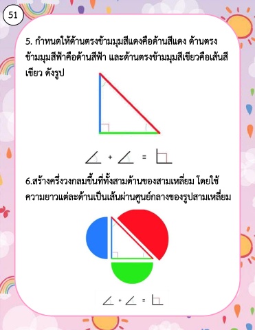 51 5. ก าหนดให้ด้านตรงข้ามมุมสีแดงคือด้านสีแดง ด้านตรง ข้ามมุมสีฟ้าคือด้านสีฟ้า และด้านตรงข้ามมุมสีเขียวคือเส้นสี เขียว ดังรูป 6.สร้างครึ่งวงกลมขึ้นที่ทั้งสามด้านของสามเหลี่ยม โดยใช้ ความยาวแต่ละด้านเป็นเส้นผ่านศูนย์กลางของรูปสามเหลี่ยม
