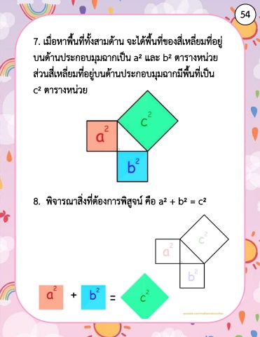 54 7. เมื่อหาพื้นที่ทั้งสามด้าน จะได้พื้นที่ของสี่เหลี่ยมที่อยู่ บนด้านประกอบมุมฉากเป็น a² และ b² ตารางหน่วย ส่วนสี่เหลี่ยมที่อยู่บนด้านประกอบมุมฉากมีพื้นที่เป็น c² ตารางหน่วย 8. พิจารณาสิ่งที่ต้องการพิสูจน์ คือ a² + b² = c²