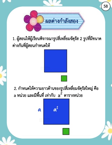 58 ผลต่างก าลังสอง 1. ผู้สอนให้ผู้เรียนพิจารณารูปสี่เหลี่ยมจัตุรัส 2 รูปที่มีขนาด ต่างกันที่ผู้สอนก าหนดให้ 2. ก าหนดให้ความยาวด้านของรูปสี่เหลี่ยมจัตุรัสใหญ่ คือ 2 a a หน่วย และมีพื้นที่ เท่ากับ ตารางหน่วย