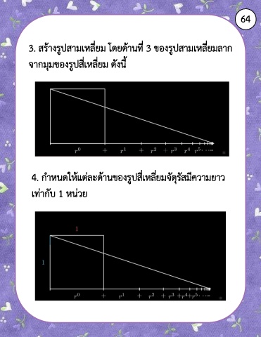 64 3. สร้างรูปสามเหลี่ยม โดยด้านที่ 3 ของรูปสามเหลี่ยมลาก จากมุมของรูปสี่เหลี่ยม ดังนี้ 4. ก าหนดให้แต่ละด้านของรูปสี่เหลี่ยมจัตุรัสมีความยาว เท่ากับ 1 หน่วย