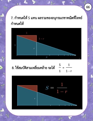 66 7. ก าหนดให้ S แทน ผลรวมของอนุกรมเรขาคณิตที่โจทย์ ก าหนดให้ S 1 8. ใช้สมบัติสามเหลี่ยมคล้าย จะได้ = 1 1 - r