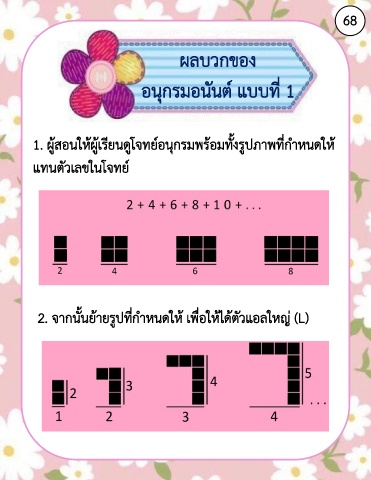 68 ผลบวกของ อนุกรมอนันต์ แบบที่ 1 1. ผู้สอนให้ผู้เรียนดูโจทย์อนุกรมพร้อมทั้งรูปภาพที่ก าหนดให้ แทนตัวเลขในโจทย์ 2. จากนั้นย้ายรูปที่ก าหนดให้ เพื่อให้ได้ตัวแอลใหญ่ (L)