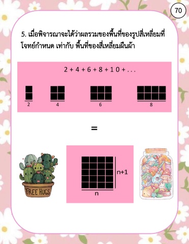 70 5. เมื่อพิจารณาจะได้ว่าผลรวมของพื้นที่ของรูปสี่เหลี่ยมที่ โจทย์ก าหนด เท่ากับ พื้นที่ของสี่เหลี่ยมผืนผ้า =