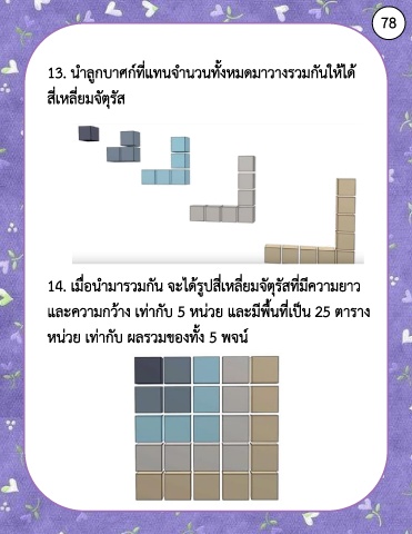 78 13. น าลูกบาศก์ที่แทนจ านวนทั้งหมดมาวางรวมกันให้ได้ สี่เหลี่ยมจัตุรัส 14. เมื่อน ามารวมกัน จะได้รูปสี่เหลี่ยมจัตุรัสที่มีความยาว และความกว้าง เท่ากับ 5 หน่วย และมีพื้นที่เป็น 25 ตาราง หน่วย เท่ากับ ผลรวมของทั้ง 5 พจน์