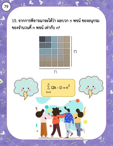 79 15. จากการพิจารณาจะได้ว่า ผลบวก n พจน์ ของอนุกรม ของจ านวนคี่ n พจน์ เท่ากับ n² n 2 (2k -1) = n k=1