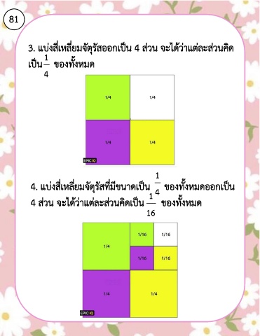81 3. แบ่งสี่เหลี่ยมจัตุรัสออกเป็น 4 ส่วน จะได้ว่าแต่ละส่วนคิด 1 เป็น ของทั้งหมด 4 1 4. แบ่งสี่เหลี่ยมจัตุรัสที่มีขนาดเป็น ของทั้งหมดออกเป็น 4 1 4 ส่วน จะได้ว่าแต่ละส่วนคิดเป็น ของทั้งหมด 16