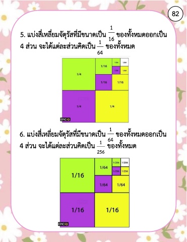 82 1 5. แบ่งสี่เหลี่ยมจัตุรัสที่มีขนาดเป็น ของทั้งหมดออกเป็น 16 1 4 ส่วน จะได้แต่ละส่วนคิดเป็น ของทั้งหมด 64 1 6. แบ่งสี่เหลี่ยมจัตุรัสที่มีขนาดเป็น ของทั้งหมดออกเป็น 64 1 4 ส่วน จะได้แต่ละส่วนคิดเป็น ของทั้งหมด 256