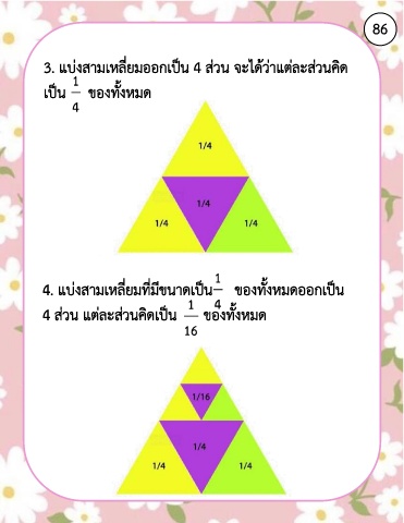 86 3. แบ่งสามเหลี่ยมออกเป็น 4 ส่วน จะได้ว่าแต่ละส่วนคิด 1 เป็น ของทั้งหมด 4 1 4. แบ่งสามเหลี่ยมที่มีขนาดเป็น ของทั้งหมดออกเป็น 4 1 4 ส่วน แต่ละส่วนคิดเป็น ของทั้งหมด 16