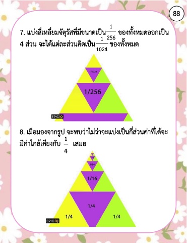 88 1 7. แบ่งสี่เหลี่ยมจัตุรัสที่มีขนาดเป็น ของทั้งหมดออกเป็น 256 1 4 ส่วน จะได้แต่ละส่วนคิดเป็น ของทั้งหมด 1024 8. เมื่อมองจากรูป จะพบว่าไม่ว่าจะแบ่งเป็นกี่ส่วนค่าที่ได้จะ 1 มีค่าใกล้เคียงกับ เสมอ 4