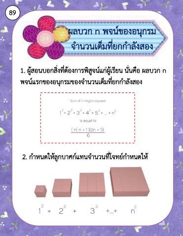 89 ผลบวก n พจน์ของอนุกรม จ านวนเต็มที่ยกก าลังสอง 1. ผู้สอนบอกสิ่งที่ต้องการพิสูจน์แก่ผู้เรียน นั่นคือ ผลบวก n พจน์แรกของอนุกรมของจ านวนเต็มที่ยกก าลังสอง 2. ก าหนดให้ลูกบาศก์แทนจ านวนที่โจทย์ก าหนดให้