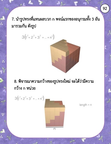 92 7. น ารูปทรงที่แทนผลบวก n พจน์แรกของอนุกรมทั้ง 3 อัน มารวมกัน ดังรูป 8. พิจารณาความกว้างของรูปทรงใหม่ จะได้ว่ามีความ กว้าง n หน่วย