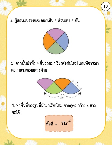 10 2. ผู้สอนแบ่งวงกลมออกเป็น 4 ส่วนเท่า ๆ กัน 3. จากนั้นน าทั้ง 4 ชิ้นส่วนมาเรียงต่อกันใหม่ และพิจารณา ความยาวของแต่ละด้าน 4. หาพื้นที่ของรูปที่น ามาเรียงใหม่ จากสูตร กว้าง x ยาว จะได้ พื้นที่ = πr 2