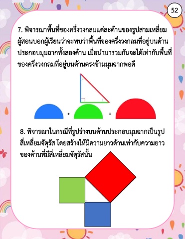 ผู้สอนบอกผู้เรียนว่าจะพบว่าพื้นที่ของครึ่งวงกลมที่อยู่บนด้าน