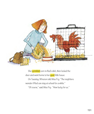 She sprinkled corn in Red’s dish, then locked the door and went home to her quiet little house. On Tuesday, Winston told Miss Fry, “The neighbors wonder if Red can stay at school for a while.” “Of course,” said Miss Fry. “How lucky for us.” 151
