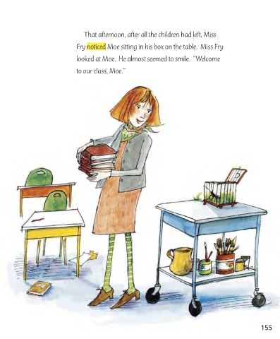 That afternoon, after all the children had left, Miss Fry noticed Moe sitting in his box on the table. Miss Fry looked at Moe. He almost seemed to smile. “Welcome to our class, Moe.” 155