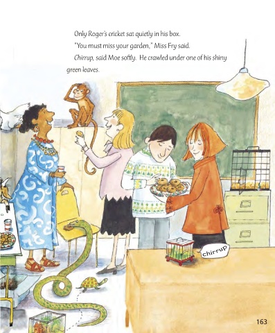 Only Roger’s cricket sat quietly in his box. “You must miss your garden,” Miss Fry said. Chirrup, said Moe softly. He crawled under one of his shiny green leaves. c hi rru p 163