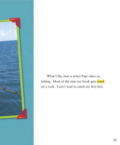 What I like best is when Papi takes us fishing. Most of the time my hook gets stuck on a rock. I can’t wait to catch my first fish. 57