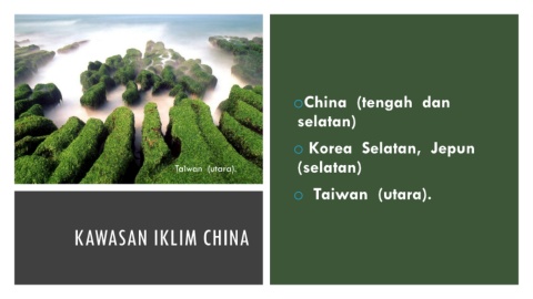 oChina (tengah dan selatan) o Korea Selatan, Jepun Taiwan (utara). (selatan) o Taiwan (utara). KAWASAN IKLIM CHINA
