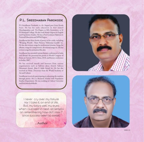 P.L.Sreedharan Parokode is a bi- lingual poet from Kerala