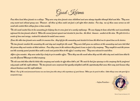 Moral: One of the most prominent lessons one can learn from this story is the importance of good karma. When you do good to others, better things come into your life in