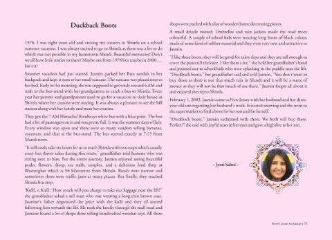 Summer vacation had just started. Jasmin packed her Bata sandals in her “Duckback boots,” her grandfather said and told Jasmin, “You don't want to