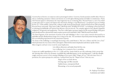 providence for copious prospective endeavors. I penned these lines for “Shapes of Love” from my core: of words. This book is a consummate book of pictorial poetry that is a handiwork of artistic masterpiece. I wish the poets