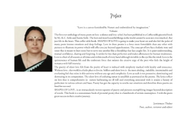 providence for copious prospective endeavors. I penned these lines for “Shapes of Love” from my core: of words. This book is a consummate book of pictorial poetry that is a handiwork of artistic masterpiece. I wish the poets