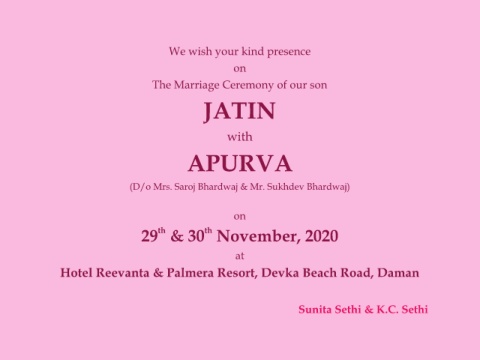We wish your kind presence on The Marriage Ceremony of our son JATIN with APURVA (D/o Mrs. Saroj Bhardwaj & Mr. Sukhdev Bhardwaj) on th th 29 & 30 November, 2020 at Hotel Reevanta & Palmera Resort, Devka Beach Road, Daman Sunita Sethi & K.C. Sethi