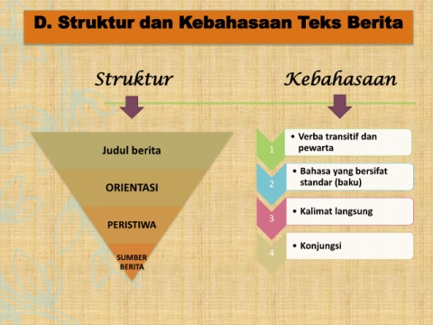 D. Struktur dan Kebahasaan Teks Berita Struktur Kebahasaan • Verba transitif dan Judul berita 1 pewarta • Bahasa yang bersifat ORIENTASI 2 standar (baku) • Kalimat langsung 3 PERISTIWA • Konjungsi 4 SUMBER BERITA
