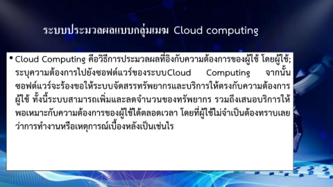 •Cloud Computing คือวิธีกำรประมวลผลที่อิงกับควำมต้องกำรของผู้ใช้ โดยผู้ใช้;