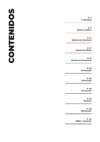 CONTENIDOS P. 7 La Escuela P. 9 Diseño Gráfico P. 13 Diseño de Interiores P. 17 Diseño de Moda P. 21 Diseño de Productos P. 25 Graduados P. 29 Entrevista P. 35 Concursos P. 37 Eventos P. 39 Asociación P. 43 RRSS - Contacto