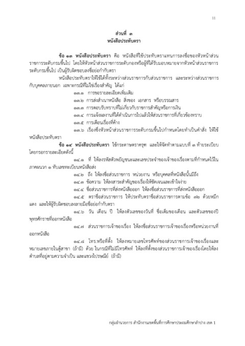 ข้อ ๑๓ หนังสือประทับตรา คือ หนังสือที่ใข้ประทับตราแทนการลงซื่อของหัวหน้าส่วน