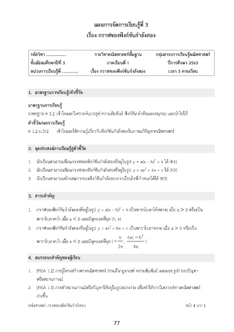 หน่วยการเรียนรู้ที่ ............... เรื่อง กราฟของฟงก์ชันก าลังสอง เวลา 3 คาบเรียน