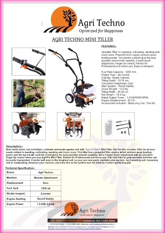 Now easily weed, mix in fertilizer, cultivate and aerate garden soil with “Agri Techno ” Mini Tiller. Opt for this versatile Tiller for all your