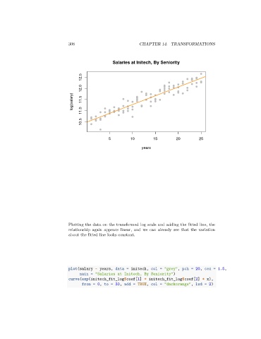 plot(salary ~ years, data = initech, col = "grey", pch = 20, cex = 1.5,