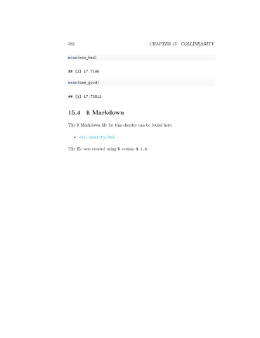 382 CHAPTER 15. COLLINEARITY mean(mse_bad) ## [1] 17.7186 mean(mse_good) ## [1] 17.70513 15.4 R Markdown The R Markdown file for this chapter can be found here: • collinearity.Rmd The file was created using R version 4.1.0.