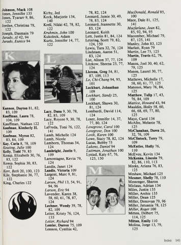 Jurado, A l 42, 94 Kukoleck, Ada Lett, Justin 81, 84, 124 Macomber, Michael 79,