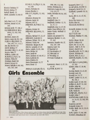 Jaworski, Ellen 11,41,85 Jones, Angela 33,85,106 JV Baseball 43