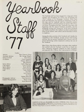 YEARBOOK STAFF 76-77, ON FLOOR: Katie McNeil. KNEELING: Debbie Matusek, Judy